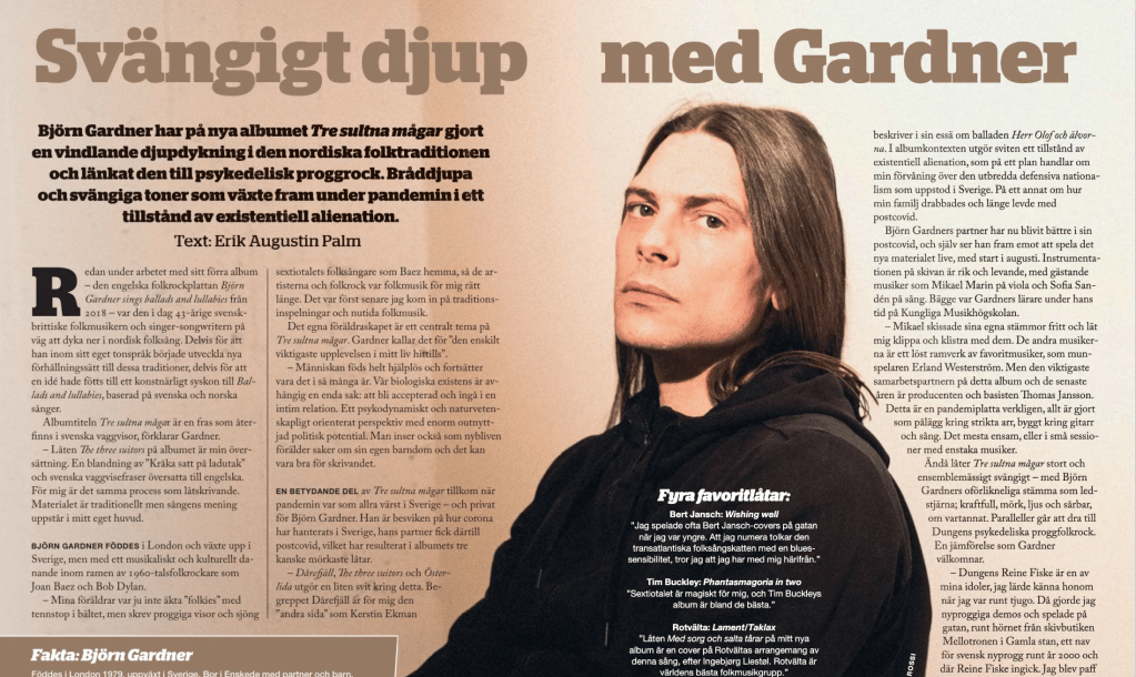 On his new album Tre Sultna Mågar, Björn Gardner dives into the depths of Nordic folk tradition, linking it to psychedelic rock. Beckoning tones from the abyss, conceived during the pandemic in a state of existential alienation.